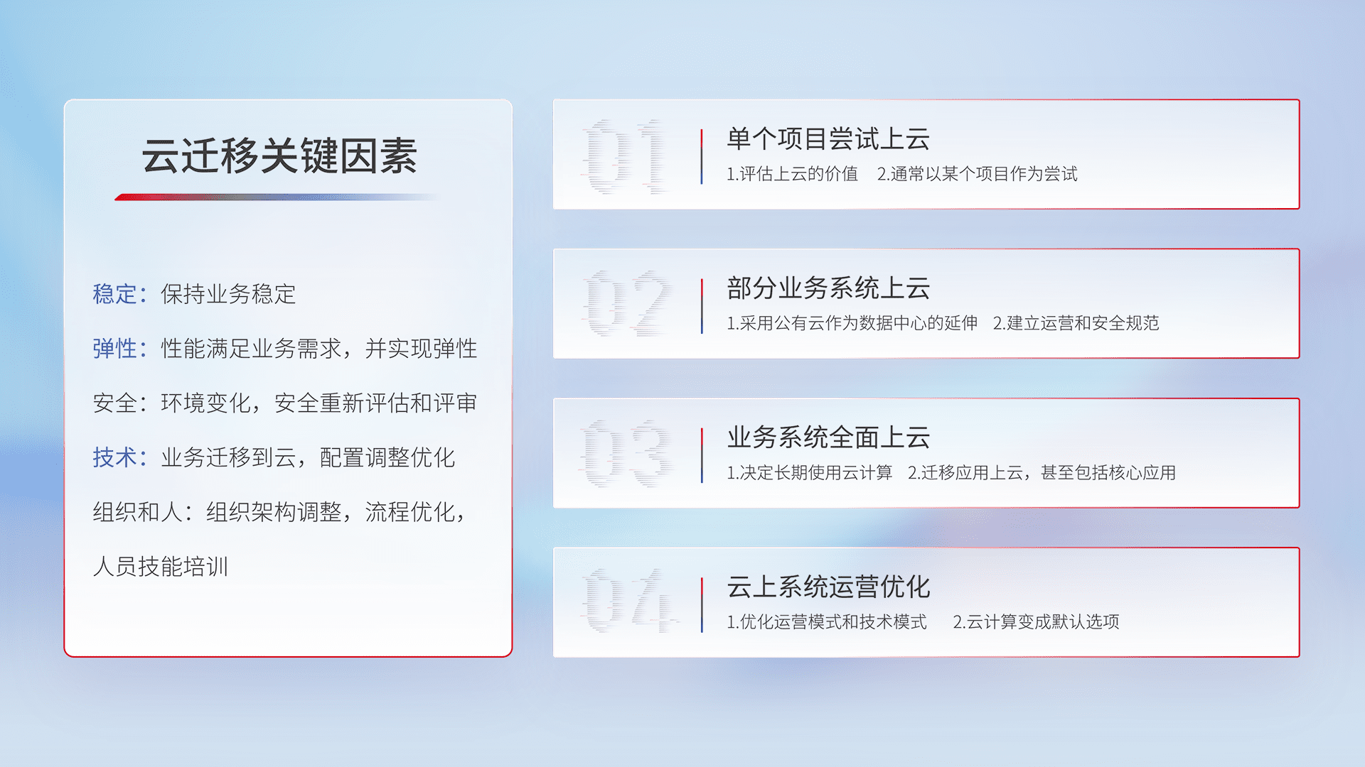 结合实际业务,,从规划设计、、云平台选型、、云原生改造、、、、数据迁移、、集成交付,,,,迁移全过程为客户识别最佳上云路径,,做好风险识别管理,,,设计网络架构、、、、身份权限、、、、安全审计合规、、、、操作审计、、、日志审计、、监控告警策略、、、多站点容灾设计等,,,,对云上基础设施进行整体规划,,,提升IT治理水平,,,,以满足弹性、、高可用、、、、高性能的需求。。。。