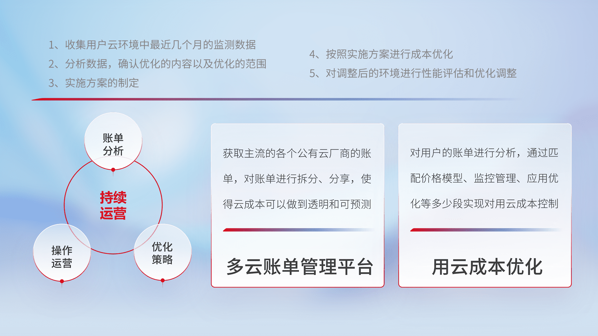 通过多云纳管,,,以统一的资源数据模型把客户的云资源进行抽象和封装,,,进而实现对多云资源的统一操作,,保障云资源管理的可靠性、、稳定性与可用性。。。量身定制化运维内容,,,,配置、、开发运维、、补丁管理、、备份、、、监控、、、、认证和访问管理、、、审计和日常巡检等,,,,保障在用云过程中的可靠度,,稳定度以及高可用率。。。